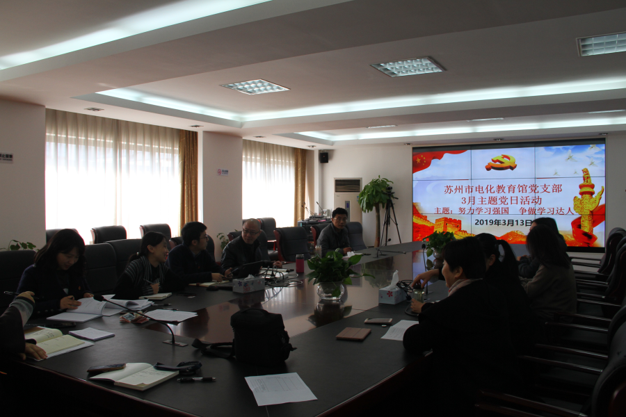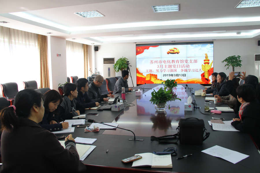 2019年3月13日,苏州市电化教育馆党支部开展以“努力学习强国,争做学习达人”为主题的2019年3月主题党日活动,党支部俞伽书记主持“学习强国”学习交流座谈会,全体党员分享学习经验,交流学习体会。