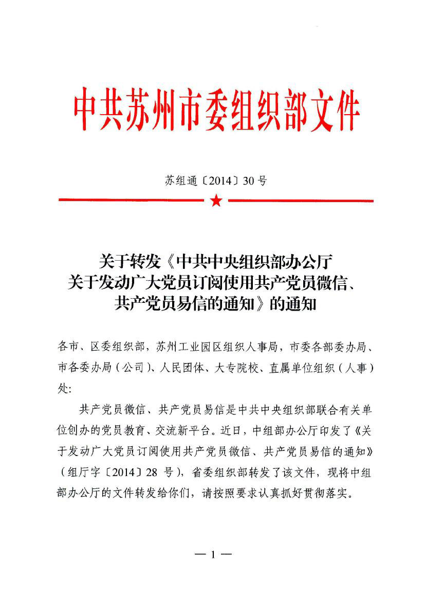 苏组通[2014]30号--关于转发《中共中央组织部办公厅关于发动广大党员订阅使用共产党员微信、共产党员易信的通知》的通知